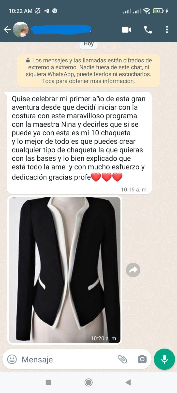 «Este curso transformó mi vida. Ahora tengo mi propia marca de chaquetas y blazers femeninos, y disfruto de la independencia económica y la libertad de manejar mi tiempo. ¡Una inversión en mi futuro!»